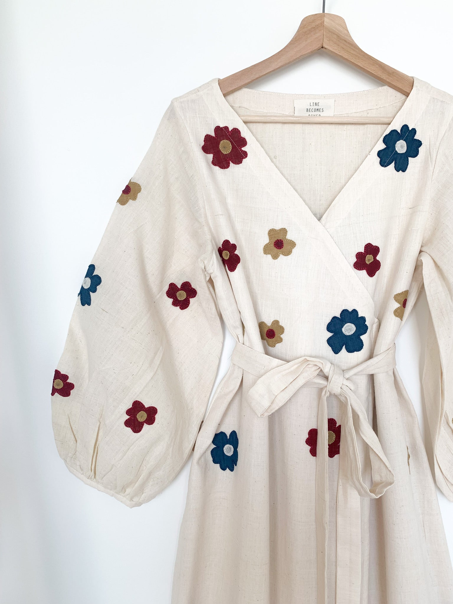 Our new wrap dress with beautiful hand appliqué 🪡🧵flowers 🌺🌼on hand-loomed locally grown organic cotton🌿, made in collaboration with @porgaiartisans