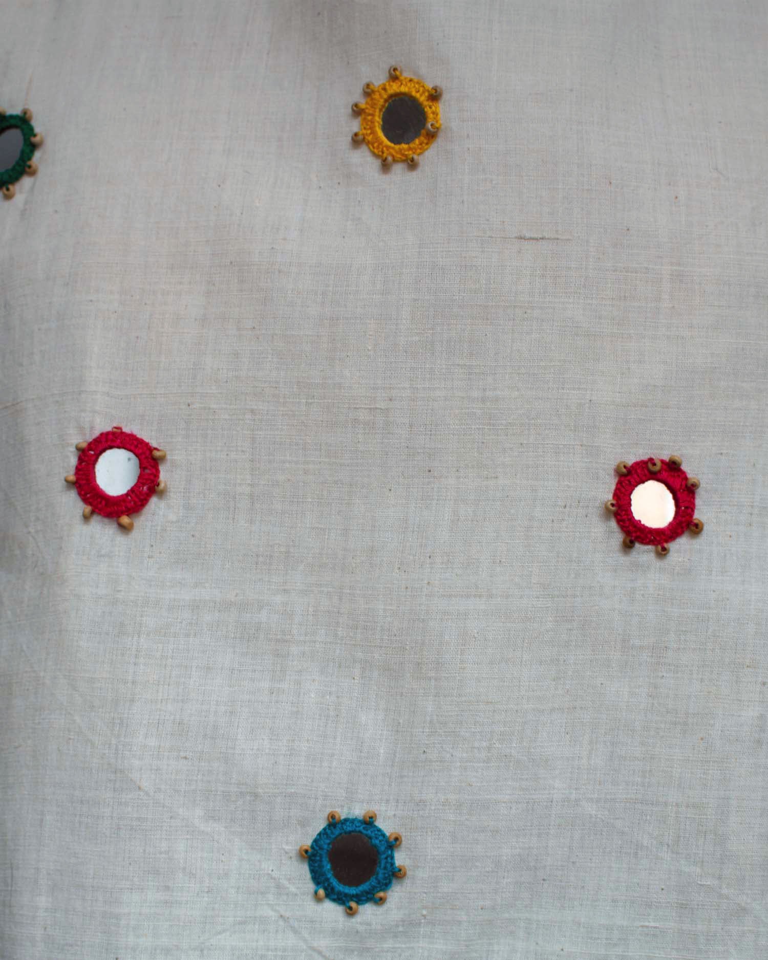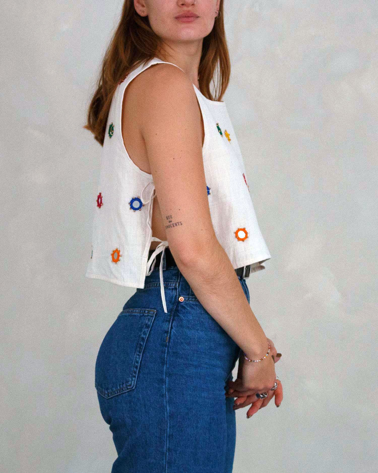 A summer vest featuring side tie ups. Handwoven locally grown organic cotton and hand embroidered mirror work🪡🧵.