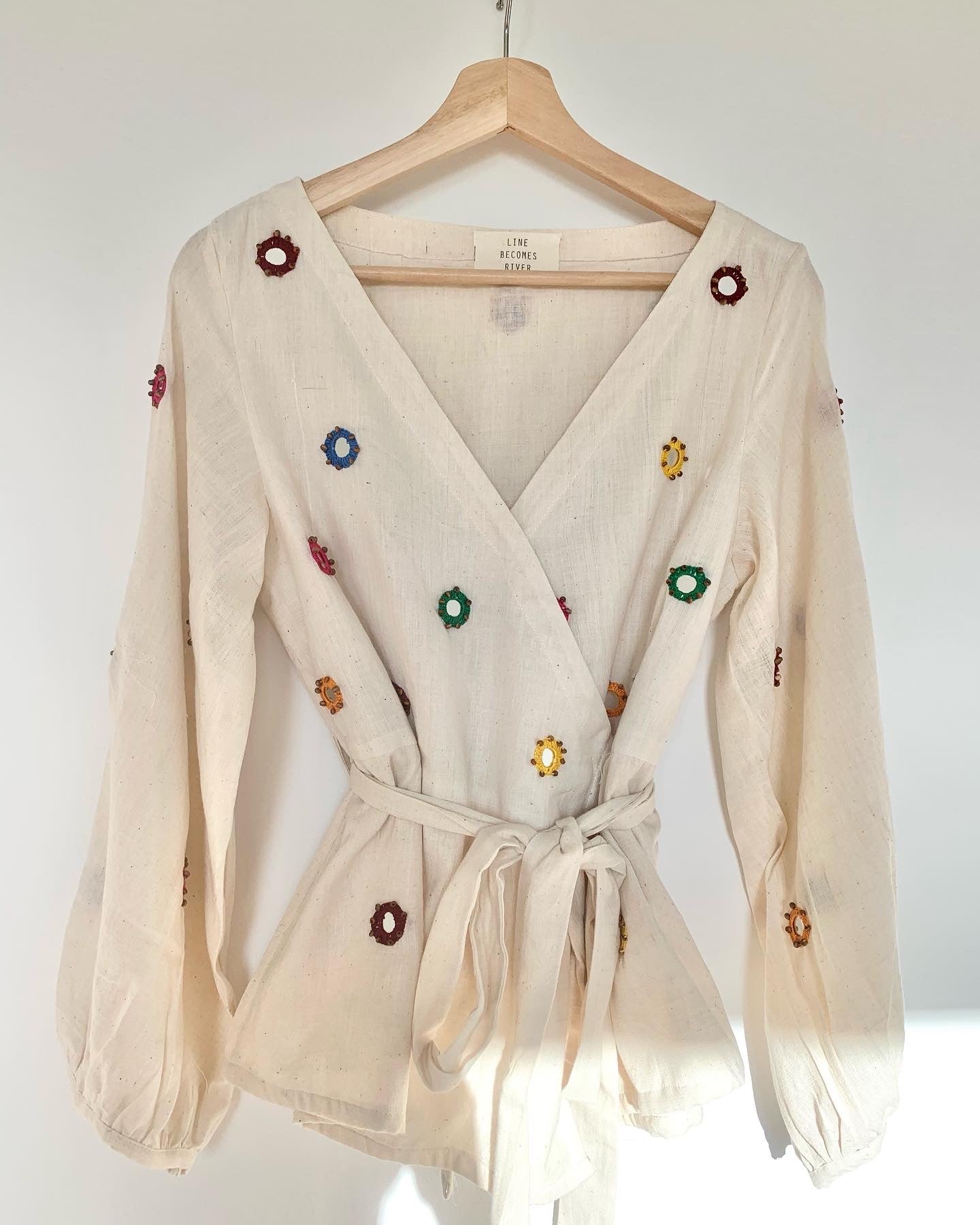 Hand embroidered mirror work done on locally grown hand woven organic cotton. Made by the women of Porgai Artisans (NGO) in the Sittlingi Valley, Tamil Nadu, India.